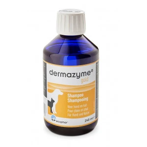 Dermazyme Gold is een combinatie van een lotion en een shampoo voor honden en katten ter verzorging van droge tot zeer droge huid met neiging tot schubvorming.