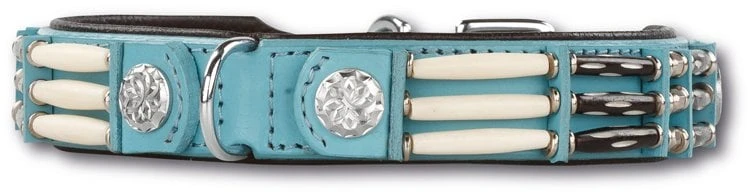 Hondenhalsband Baby Blue Eagle 25mm Deze prachtige halsband is gemaakt van zacht leer in een babyblauwe kleur. De hondenhalsband is schitterend afgezet met witte, zwarte en zilverkleurige ornamenten. Een echte blikvanger ! Voor extra comfort voor uw hond is de halsband gevoerd met zacht kalfsleer. Er is ook een hondenhalsband in een smallere versie leverbaar. De bijpassende riemen zijn verkrijgbaar: de hondenriem, 10 mm breed of de hondenriem, 18 mm breed. Bepaal de juiste maat voor uw hond: