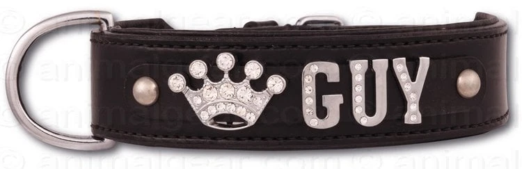 Hondenhalsband met naam Large Black De zwarte halsband is gemaakt van dubbellaags leer en is gevoerd met kalfsleer. Wat is er leuker dan een mooie leren halsband met de naam van uw huisdier in fraaie strass letters op de halsband ? Een echt uniek exemplaar voor uw hond, waarmee u en uw hond zeker op zullen vallen ! Op deze hondenhalsband is er plaats voor een naam van maximaal 6 letters. De letters worden door ons op de halsband geplaatst ! Als u een decoratief element toe wilt voegen (een kroontje of een pootje), kunt u per element 2 letters minder plaatsen daar deze elementen ongeveer tweemaal zoveel plaats innemen als een letter. Een kroontje of een pootje dient u apart toe te voegen aan uw bestelling. Losse letters of de halsband zonder letters zijn apart te bestellen, neemt u daarvoor even contact met ons op. Let op dat u in het vakje ‘naam van de hond’ de naam invult, anders kan de bestelling niet worden afgerond. Bepaal de juiste maat voor uw hond: