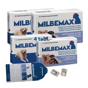 Milbemax Hond Groot 50 tabl. 5-75kgMilbemax tabletten doden rondwormen, haakwormen, zweepwormen en lintwormen. Daarnaast is dit middel inzetbaar tegen longwormen bij honden.Belangrijkste voordelen:? Het breedste werkingsspectrum van alle orale ontwormmiddelen voor honden? Ter voorkoming van hartworm? Tegen longwormen Inzetbaar bij:? Geschikt voor pups vanaf 1 kg lichaamsgewicht? Drachtige en lacterende teven Gewicht van de hond DoseringKleine honden en pups 1 tot 5 kg 1 kauwtablet Milbemax kleine hondHonden 5 – 25 kg 1 kauwtablet Milbemax grote hondHonden 25 – 50 kg 2 kauwtabletten Milbemax grote hondHonden 50 – 75 kg 3 kauwtabletten Milbemax grote hond Werkzame bestanddelen:Milbemycine en PraziquantelNiet gebruiken bij honden jonger dan 4 weken of lichter dan 1 kg.